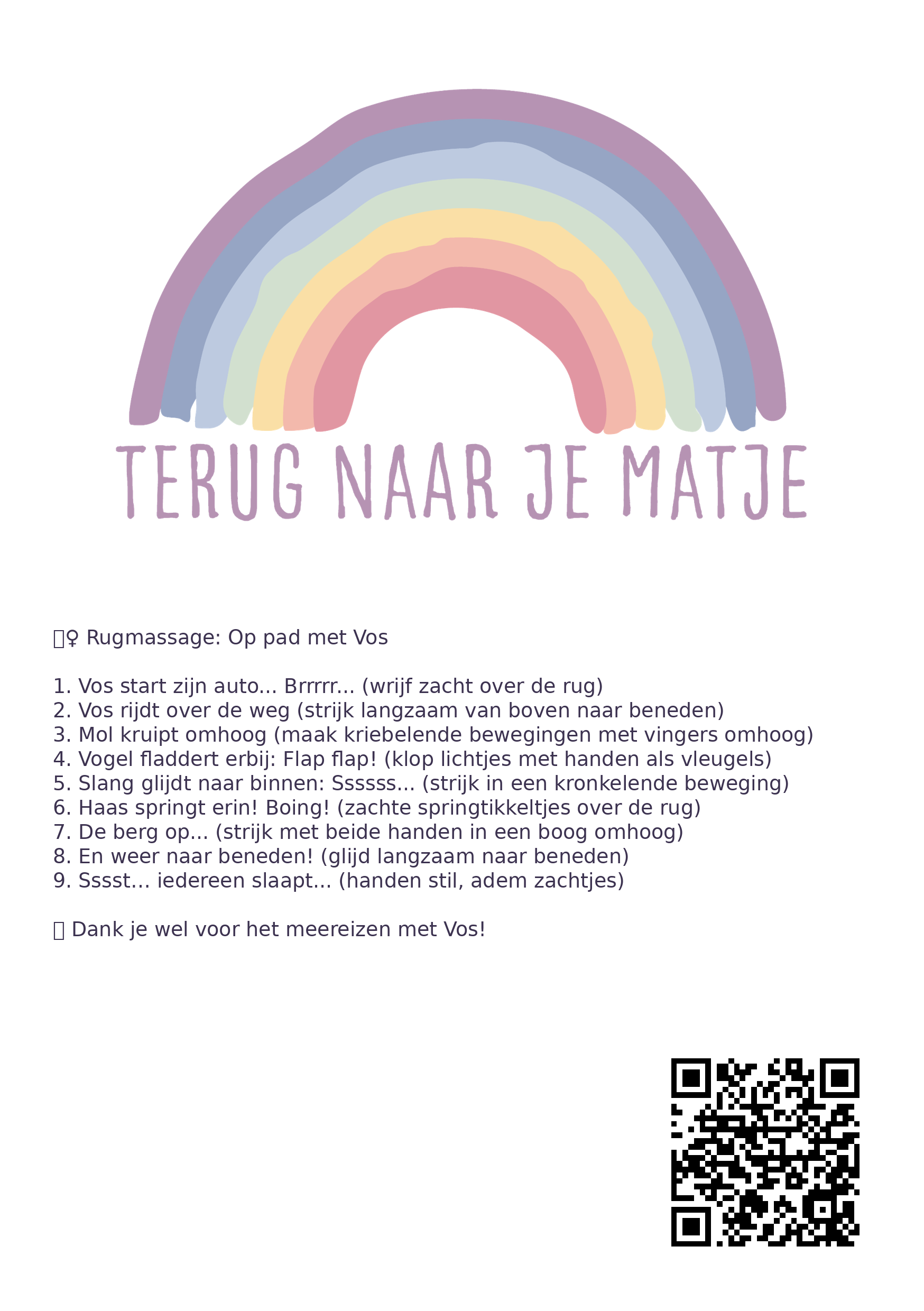 Met deze speelse kaart geef je een liefdevolle rugmassage die aansluit bij het verhaal ‘Vos gaat een stukje rijden’. Ideaal voor het bedritueel of als rustmoment tijdens een drukke dag.